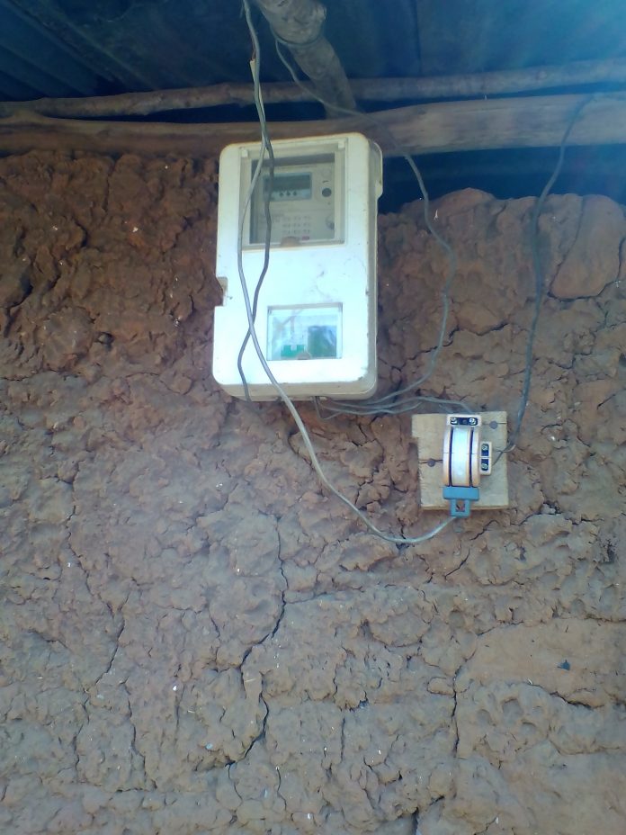 But all around him were tell-tale signs of government failures. The mini-solar grid stuck out—like a sore thumb. Kashimawo’s crib, made of mud, and covered with rusty roofing sheets , had a smart meter without a card stuck to the wall . A silvery hollow pole, like 10 feet high, stood some feet away from the hut, carrying two cables, 5.5mm thick, that connected the meter.